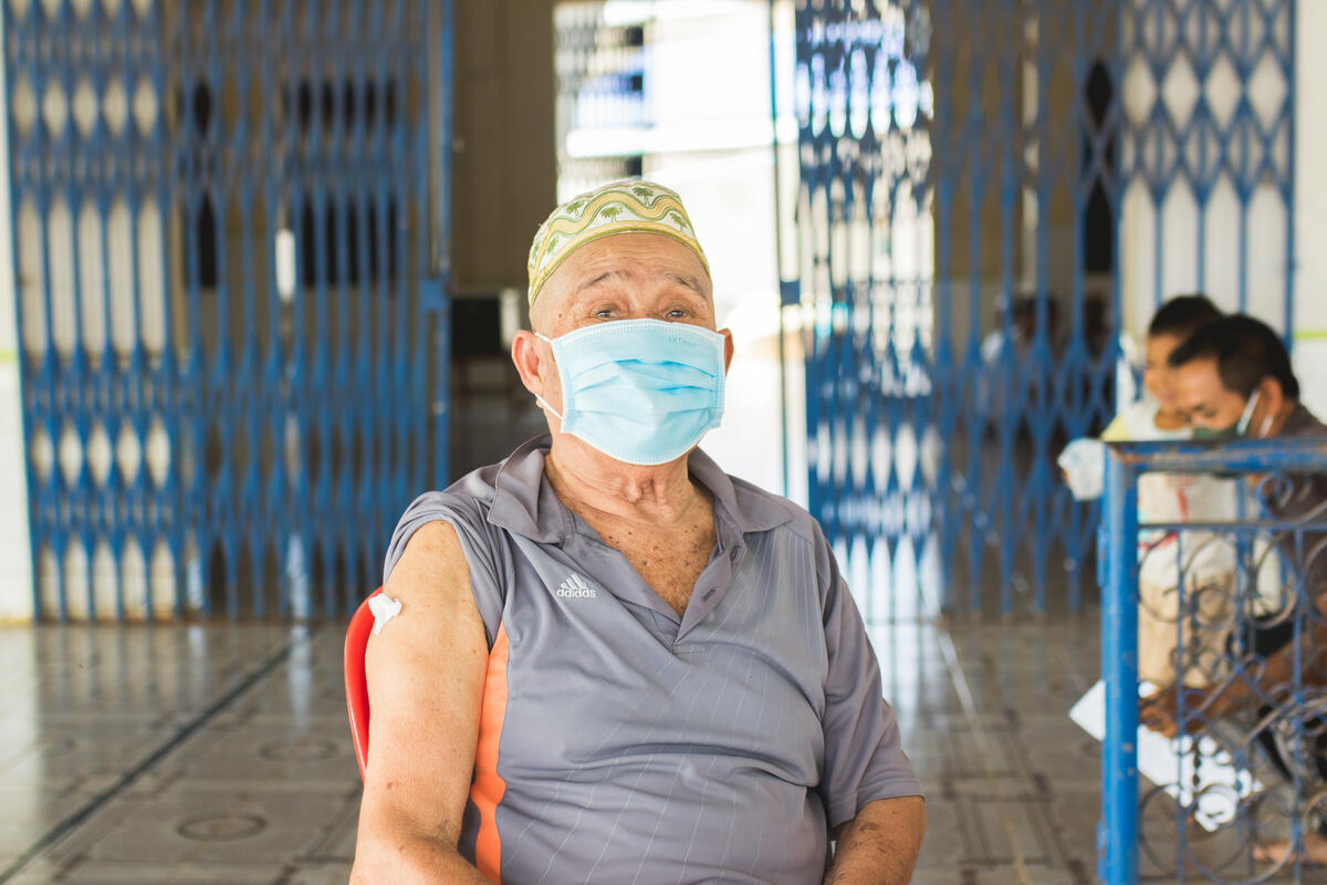 Mr Leb, a villager of the South Sarong commune, gets his dose of COVID-19 vaccination.The COVID-19 vaccination program of the Prey Thnorng Health Centre takes place in the morning at the mosque of South Saroung Commune.