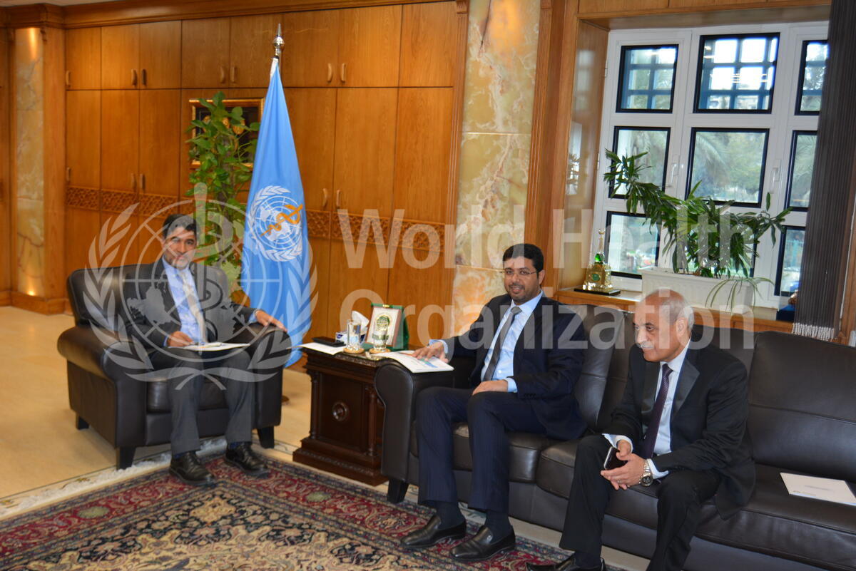 Dr Ahmed Al-Mandhari (left), WHO Regional Director for the Eastern Mediterranean meets with H.E. Sulaiman Al Dakheel (center), the General Manager of the Gulf Health Council for Cooperation Council States.-Title of WHO staff and officials reflects their respective position at the time the photo was taken.