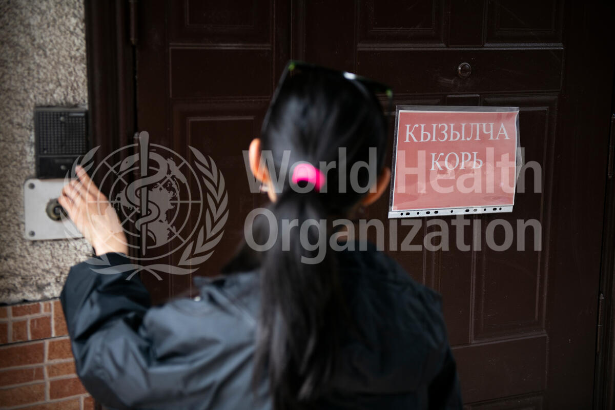 A woman rings the doorbell with the inscription "measles" at the Republican Infectious Diseases Clinical Hospital, Bishkek city, Kyrgyzstan.