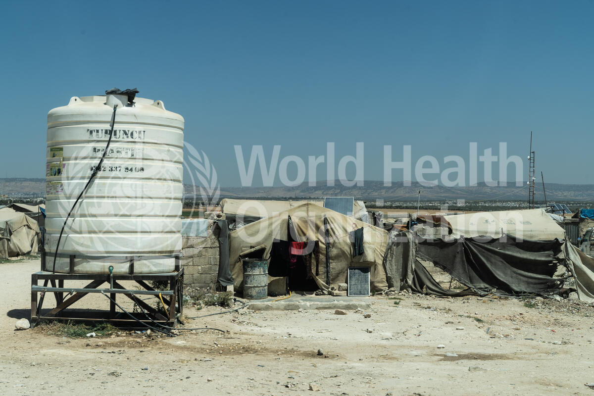 A water tank among tents at the Shamarekh IDP settlement in Azzaz, Northwest Syria. The Independent Doctors Association (IDA), a local WHO implementing partner in the Azzaz region of Northwest Syria, manages the sprawling camp.