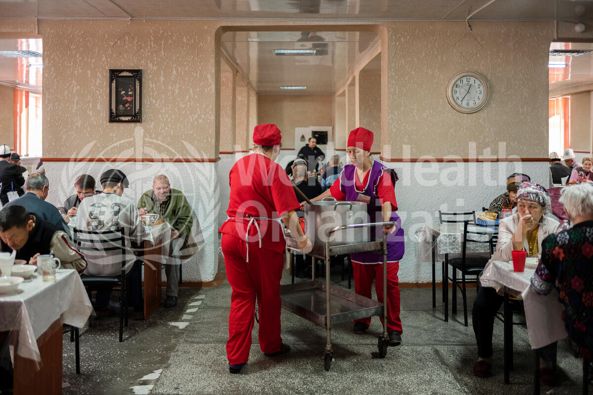 Elderly residents eat lunch at Bishkek social center for the elderly and disabled in Kyrgyzstan, 29 March 2022. The mission of WHO’s Health Emergencies Programme (WHE) is to build the capacity of Member States to manage health emergency risks, and provide effective relief and recovery to affected populations.