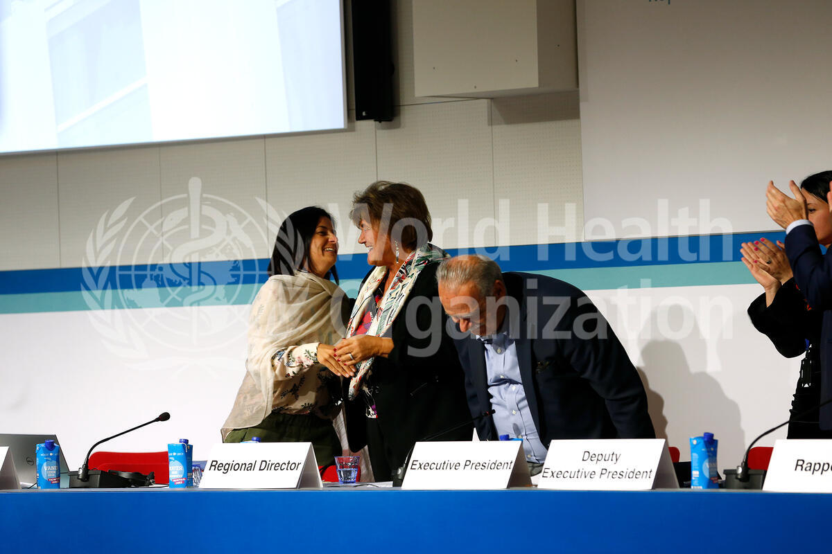 Outgoing Regional Director for EURO, Dr Zsuzsanna Jakab (centre) during the 69th session of the WHO Regional Committee for Europe..Title of WHO staff and officials reflects their respective position at the time the photo was taken.