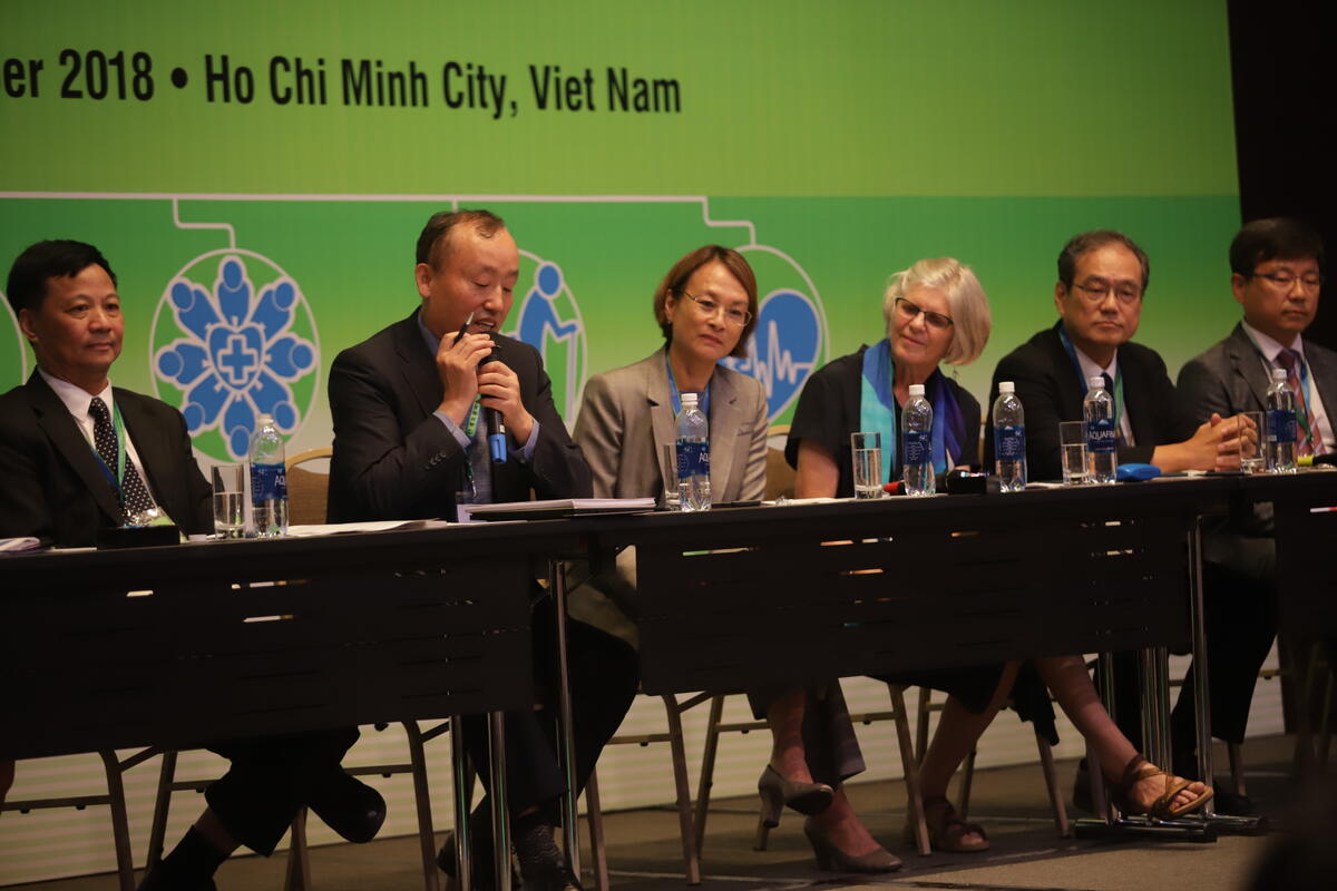 Panel discussion with the theme of "Working effectively at country level" with (from left) Dr Liu Yunguo, WHO Representative to Cambodia, Dr Kidong Park, WHO Representative to Viet Nam, Dr Ying-Ru Lo, WHO Representative to Malaysia, Brunei Darussalam and Singapore and three WHO Collaborating Centers providing their insights during the Third Regional Forum of WHO Collaborating Centres in the Western Pacific, held in Ho Chi Minh City, Viet Nam on 22–23 November 2018.