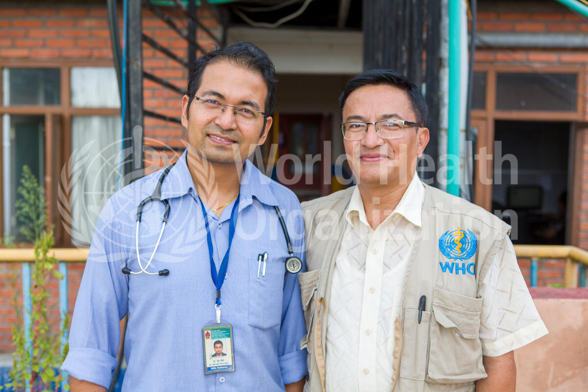 Dr Shakya Sagar, a WHO Surveillance Medical Officer, stands with Dr Dhruba Shrestha, a pediatrician at the Siddhi Memorial Hospital in Baktapur in the Kathmandu Valley. If Dr Shrestha suspects a child has a vaccine-preventable disease such as polio or measles, he calls Dr Sagar, who would investigate the child and report the case. This surveiillance is critical to confirming the presence, or absence of diseases like polio and measles. Bhaktapur, Nepal. August 2019.