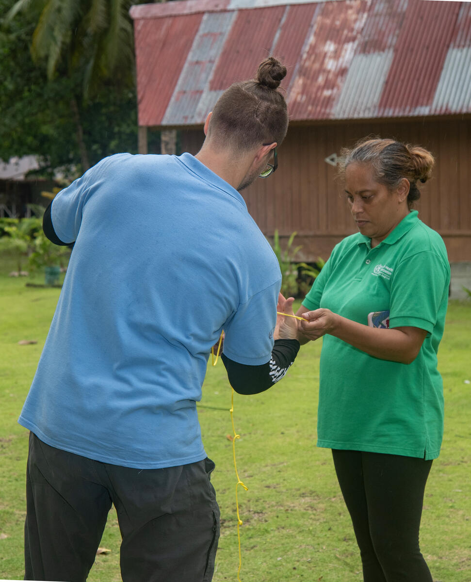 WHO consultants practice tying knots as part of a demonstration for Team Klemat during a simulated emergency preparedness exercise. Palau’s Ministry of Health and Human Services (MHHS) is working closely with WHO and the Government of Japan to support and strengthen the country’s emergency preparedness and response, including through the establishment of a national Emergency Medical Team (EMT) called Team Klemat. Palau’s EMT is named Team Klemat after the rope that holds the sails of the country’s traditional canoes – has been established to rapidly respond to sudden onset emergencies or disease outbreaks.(From left) Pierre-Yves Beauchemin, WHO Logistics Consultant, and Dr Helentina Garstang, short-term consultant in country preparedness at WHO Country Liaison Office - Federated States of Micronesia, Republic of Marshall Islands, Republic of Palau.