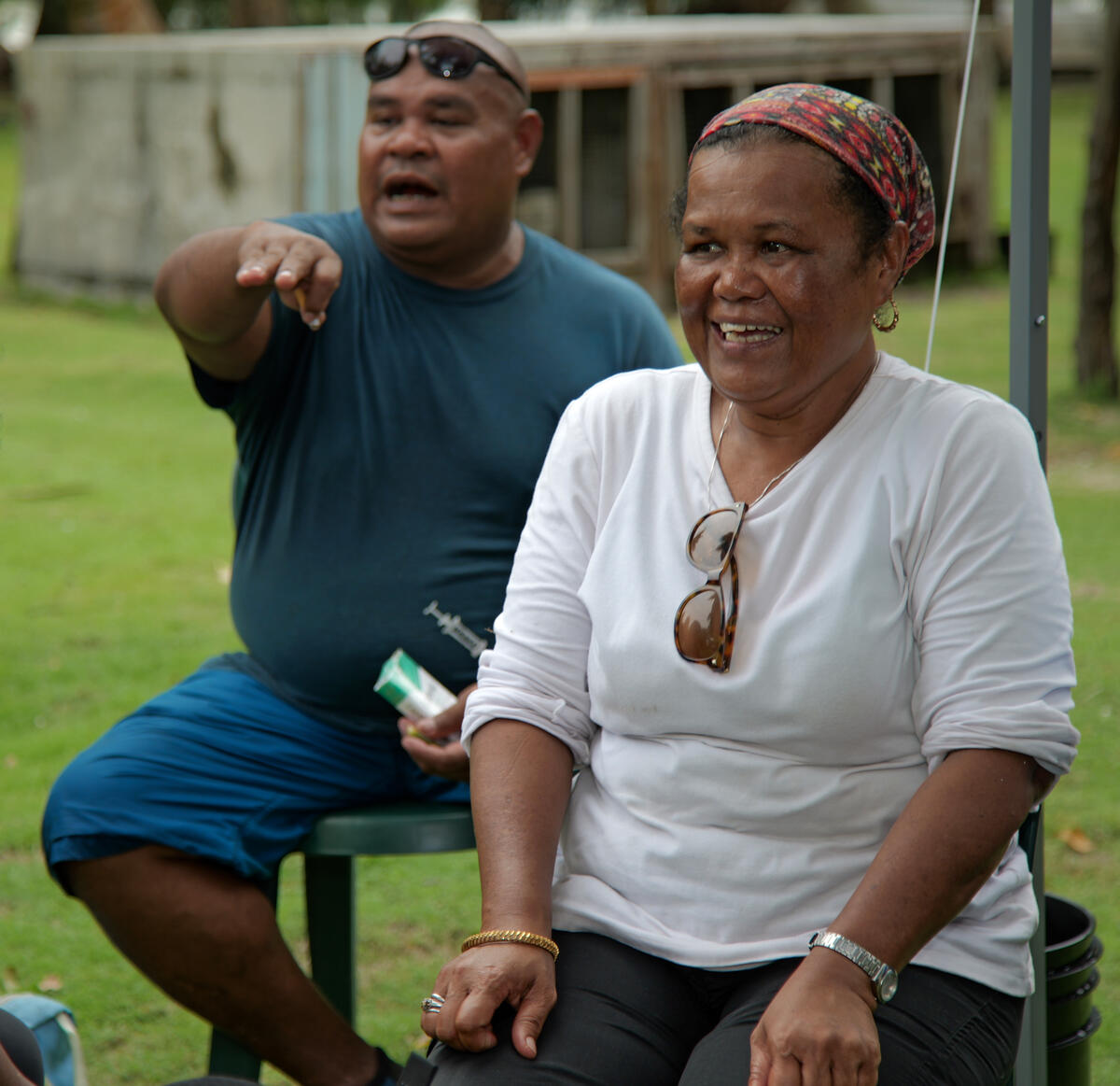 Members of Team Klemat, the Republic of Palau’s national Emergency Medical Team (EMT), debrief after carrying out a search and rescue mission during a simulated emergency preparedness exercise. Palau’s Ministry of Health and Human Services (MHHS) is working closely with WHO and the Government of Japan to support and strengthen the country’s emergency preparedness and response, including through the establishment of a national Emergency Medical Team (EMT) called Team Klemat.Palau’s EMT is named Team Klemat after the rope that holds the sails of the country’s traditional canoes – has been established to rapidly respond to sudden onset emergencies or disease outbreaks.(From left) Jackson Orak, Logistics at Palau Ministry of Health and Human Services, and Belinda Eungel, Infection Prevention Control (IPC) Nurse at Belau National Hospital.