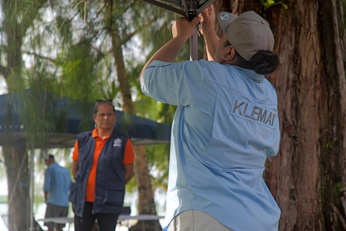 Tirisa Tirso, Medical Supplies Specialist at Palau Ministry of Health and Human Services and a member of Team Klemat, helps set up tents as part of a simulated emergency preparedness exercise. Palau’s Ministry of Health and Human Services (MHHS) is working closely with WHO and the Government of Japan to support and strengthen the country’s emergency preparedness and response, including through the establishment of a national Emergency Medical Team (EMT) called Team Klemat. Palau’s EMT is named Team Klemat after the rope that holds the sails of the country’s traditional canoes – has been established to rapidly respond to sudden onset emergencies or disease outbreaks.(Background) Dr Helentina Garstang, short-term consultant in country preparedness at WHO Country Liaison Office - Federated States of Micronesia, Republic of Marshall Islands, Republic of Palau.