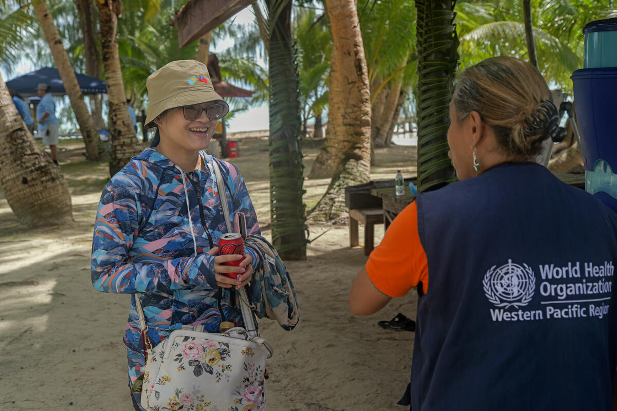 Peko Yu-Hsien Lin (left) discusses the day's simulated emergency preparedness exercises with Dr Helentina Garstang, short-term consultant in country preparedness at WHO Country Liaison Office - Federated States of Micronesia, Republic of Marshall Islands, Republic of Palau. Palau’s Ministry of Health and Human Services (MHHS) is working closely with WHO and the Government of Japan to support and strengthen the country’s emergency preparedness and response, including through the establishment of a national Emergency Medical Team (EMT) called Team Klemat. Palau’s EMT is named Team Klemat after the rope that holds the sails of the country’s traditional canoes – has been established to rapidly respond to sudden onset emergencies or disease outbreaks.