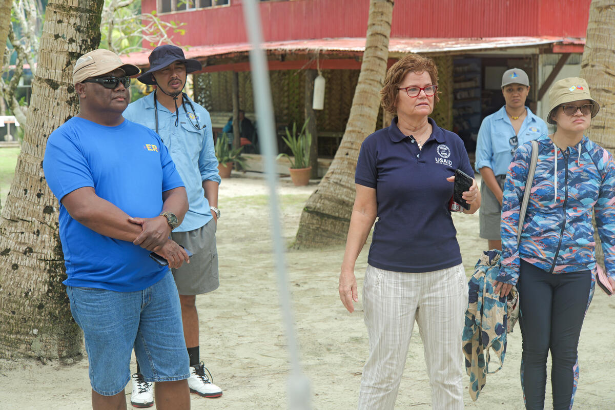 Members of Team Klemat and visiting observers listen as someone out of frame discusses the day's simulated emergency preparedness exercises with observers from various agencies. Palau’s Ministry of Health and Human Services (MHHS) is working closely with WHO and the Government of Japan to support and strengthen the country’s emergency preparedness and response, including through the establishment of a national Emergency Medical Team (EMT) called Team Klemat. USAID also provides significant funding for the EMT.Palau’s EMT is named Team Klemat after the rope that holds the sails of the country’s traditional canoes – has been established to rapidly respond to sudden onset emergencies or disease outbreaks.(From left) Dr Ngirachisau Mekoll, Director at Belau National Hospital; Dr. Jason Kalei Arurang, General Physician / Resident at Belau National Hospital; Paula Miller, USAID country coordinator - Palau; Latricia Bianca Skiwo, Registered Nurse at Belau National Hospital; and Peko Yu-Hsien Lin.