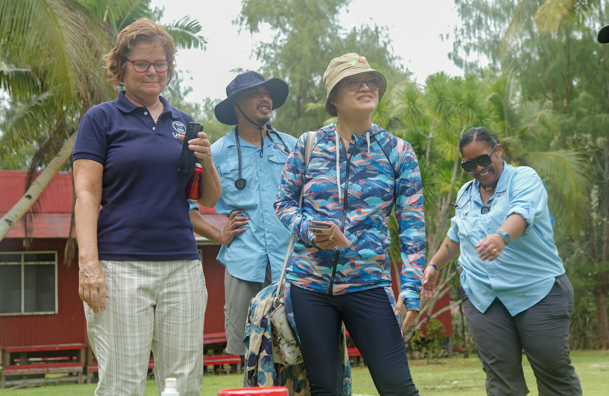 Members of Team Klemat and visiting observers laugh and discuss aspects of a simulated emergency preparedness exercise. Palau’s Ministry of Health and Human Services (MHHS) is working closely with WHO and the Government of Japan to support and strengthen the country’s emergency preparedness and response, including through the establishment of a national Emergency Medical Team (EMT) called Team Klemat. USAID also provides significant funding for the EMT. Palau’s EMT is named Team Klemat after the rope that holds the sails of the country’s traditional canoes – has been established to rapidly respond to sudden onset emergencies or disease outbreaks.(From left, background) Paula Miller, USAID country coordinator - Palau; Dr Jason Kalei Arurang, General Physician / Resident at Belau National Hospital; Peko Yu-Hsien Lin; and Dr Rachel Arurang, Medical Doctor at Belau National Hospital.