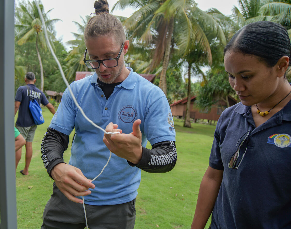 (From left) Pierre-Yves Beauchemin, WHO Logistics Consultant, demonstrates to Latricia Bianca Skiwo, Registered Nurse at Belau National Hospital and a member of Team Klemat, how to securely tie knots for tents during a simulated emergency preparedness exercise. Palau’s Ministry of Health and Human Services (MHHS) is working closely with WHO and the Government of Japan to support and strengthen the country’s emergency preparedness and response, including through the establishment of a national Emergency Medical Team (EMT) called Team Klemat.Palau’s EMT is named Team Klemat after the rope that holds the sails of the country’s traditional canoes – has been established to rapidly respond to sudden onset emergencies or disease outbreaks.
