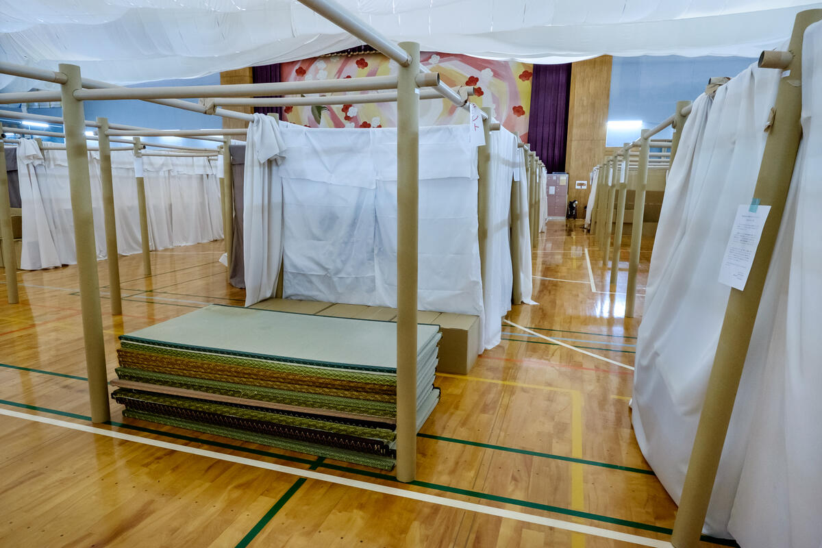 Camp set up inside a gymnasium (Mashiki Sport Center converted into evacuation center) for displaced persons following the 14 and 16 April 2016 earthquakes (magnitudes 7.0 and 6.2)