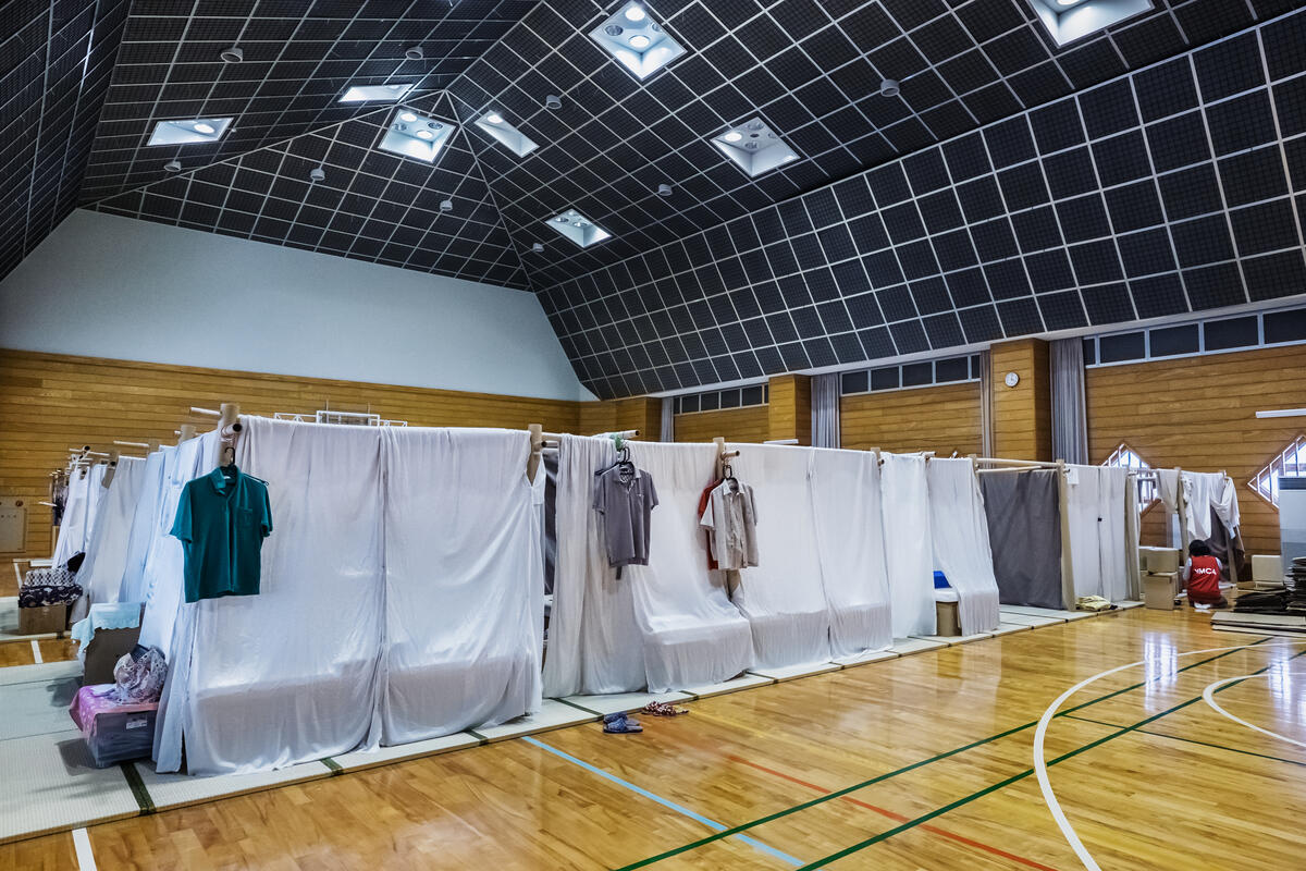 Camp set up inside a gymnasium (Mashiki Sport Center converted into evacuation center) for displaced persons following the 14 and 16 April 2016 earthquakes (magnitudes 7.0 and 6.2)