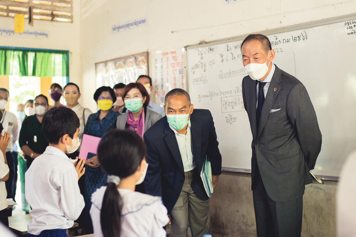 Students interact with Dr Takeshi Kasai (rightmost), WHO Regional Director for the Western Pacific, accompanied by Dr Ailan Li (with pink scarf), WHO Representative in Cambodia, and Dr Or Vandine (with yellow mask), Secretary of State, Ministry of Health Cambodia, at Toul Kork Elementary School.