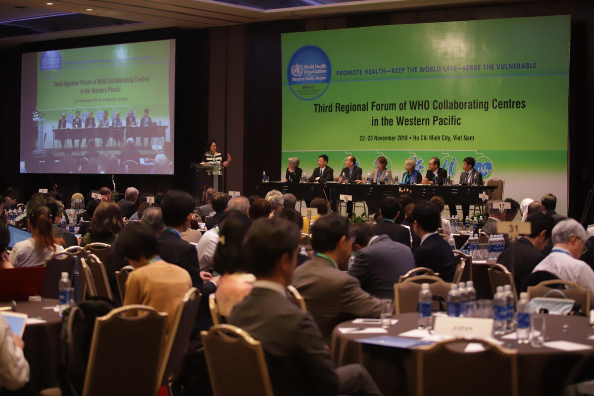 Panel discussion with the theme "Working effectively at country level" with (from left) Dr Corinne Capuano, WHO Representative to the South Pacific and Director, Pacific Technical Support, Dr Liu Yunguo, WHO Representative to Cambodia, Dr Kidong Park, WHO Representative to Viet Nam, Dr Ying-Ru Lo, WHO Representative to Malaysia, Brunei Darussalam and Singapore and three WHO Collaborating Centers providing their insights during the Third Regional Forum of WHO Collaborating Centres in the Western Pacific, held in Ho Chi Minh City, Viet Nam on 22–23 November 2018.