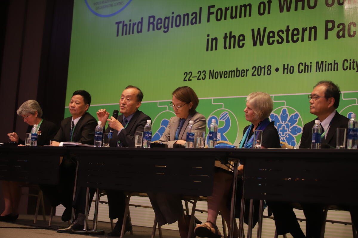 Panel discussion with the theme "Working effectively at country level" with (from left) Dr Corinne Capuano, WHO Representative to the South Pacific and Director, Pacific Technical Support, Dr Liu Yunguo, WHO Representative to Cambodia, Dr Kidong Park, WHO Representative to Viet Nam, Dr Ying-Ru Lo, WHO Representative to Malaysia, Brunei Darussalam and Singapore and three WHO Collaborating Centers providing their insights during the Third Regional Forum of WHO Collaborating Centres in the Western Pacific, held in Ho Chi Minh City, Viet Nam on 22–23 November 2018.