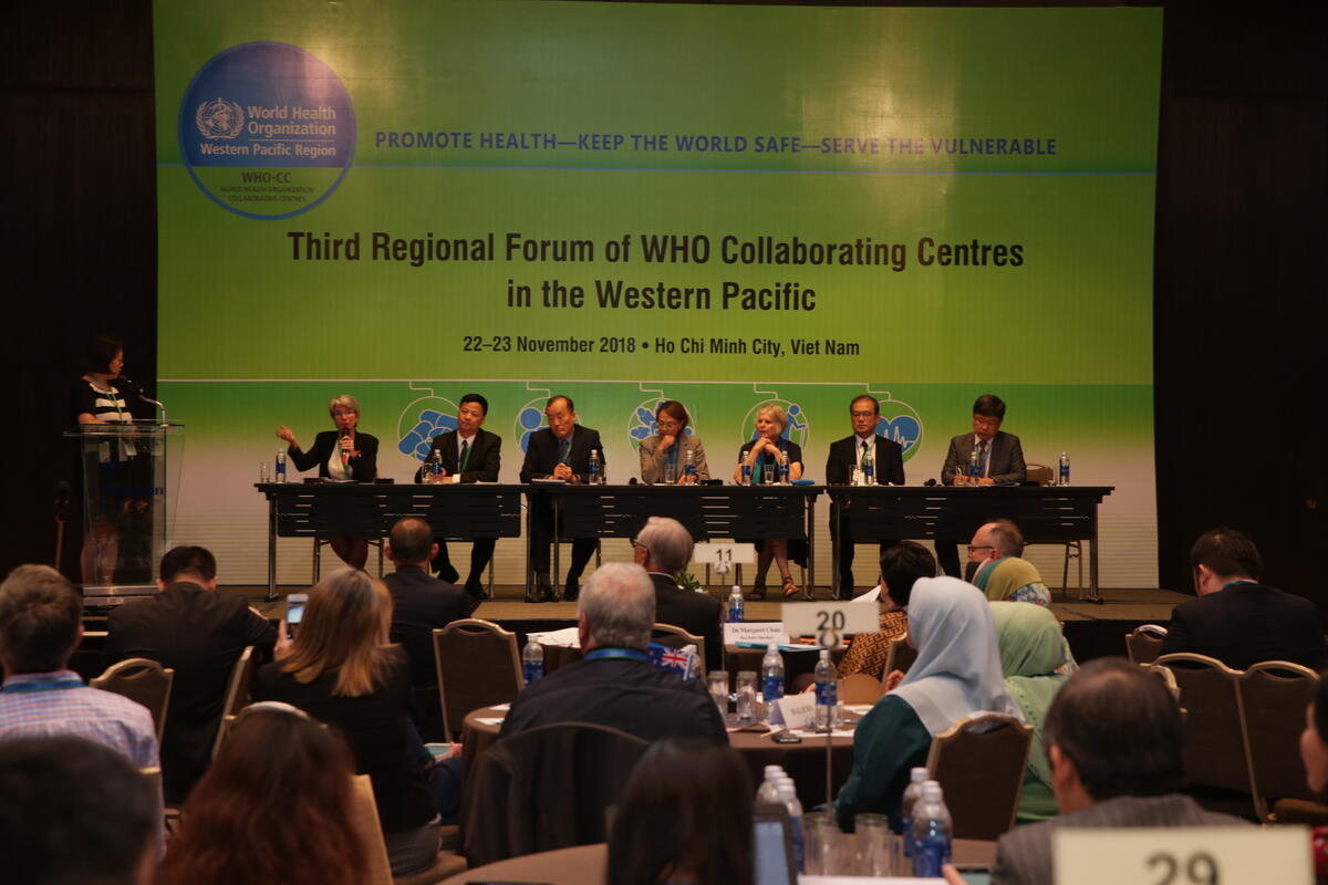 Panel discussion with the theme "Working effectively at country level" with (from left) Dr Corinne Capuano, WHO Representative to the South Pacific and Director, Pacific Technical Support, Dr Liu Yunguo, WHO Representative to Cambodia, Dr Kidong Park, WHO Representative to Viet Nam, Dr Ying-Ru Lo, WHO Representative to Malaysia, Brunei Darussalam and Singapore and three WHO Collaborating Centers providing their insights during the Third Regional Forum of WHO Collaborating Centres in the Western Pacific, held in Ho Chi Minh City, Viet Nam on 22–23 November 2018.