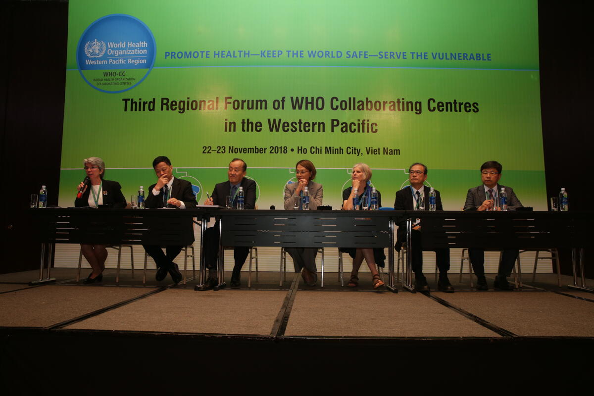Panel discussion with the theme "Working effectively at country level" with (from left) Dr Corinne Capuano, WHO Representative to the South Pacific and Director, Pacific Technical Support, Dr Liu Yunguo, WHO Representative to Cambodia, Dr Kidong Park, WHO Representative to Viet Nam, Dr Ying-Ru Lo, WHO Representative to Malaysia, Brunei Darussalam and Singapore and three WHO Collaborating Centers providing their insights during the Third Regional Forum of WHO Collaborating Centres in the Western Pacific, held in Ho Chi Minh City, Viet Nam on 22–23 November 2018.
