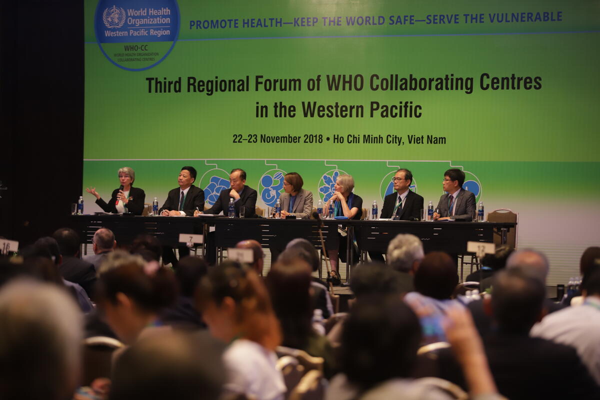 Panel discussion with the theme "Working effectively at country level" with (from left) Dr Corinne Capuano, WHO Representative to the South Pacific and Director, Pacific Technical Support, Dr Liu Yunguo, WHO Representative to Cambodia, Dr Kidong Park, WHO Representative to Viet Nam, Dr Ying-Ru Lo, WHO Representative to Malaysia, Brunei Darussalam and Singapore and three WHO Collaborating Centers providing their insights during the Third Regional Forum of WHO Collaborating Centres in the Western Pacific, held in Ho Chi Minh City, Viet Nam on 22–23 November 2018.